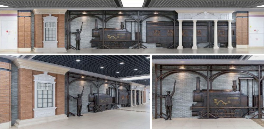 地鐵六號(hào)線工業(yè)文化主題站-復(fù)興路站《鐵路風(fēng)云-龍?zhí)枡C(jī)車(chē)》浮雕墻